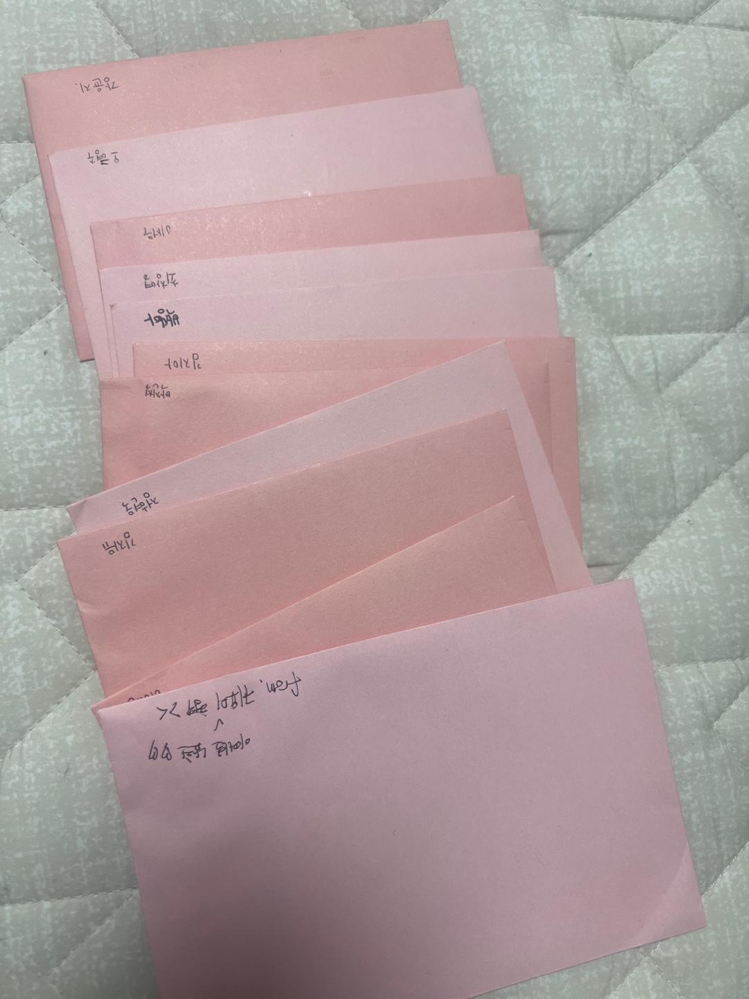 나는 책상 위에 수북이 쌓인 분홍색 편지 봉투를 쳐다봤다. 하나씩 이름이나 글귀가 적혀 있고, 봉투 안에는 각자 쓴 손편지가 들어 있을 텐데, 선뜻 열 용기가 나지 않았다. 이미 메시지만 봐도 눈물이 가시질 않는데, 그 편지를 읽으면 도대체 얼마나 울어 댈까 생각하니 그냥 또 울컥. ‘그래도… 언젠가는 읽어야지. 지금은 좀 더 맘을 추스리고 나서….’ 하고 마음먹었다.